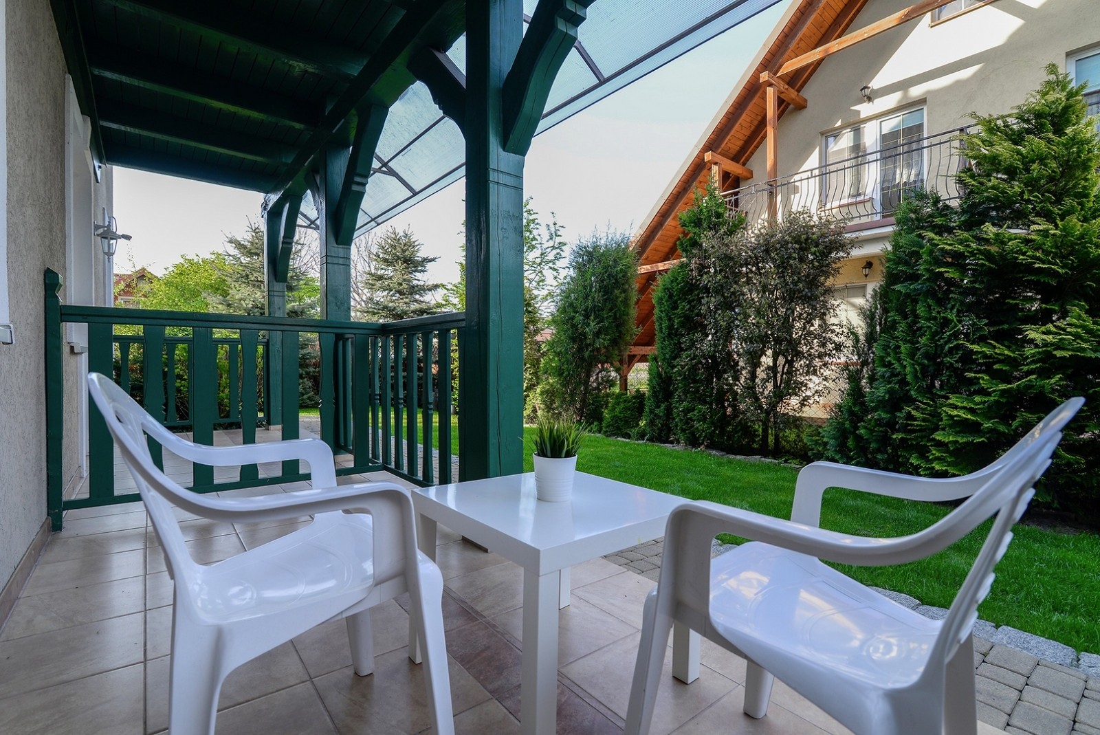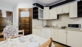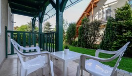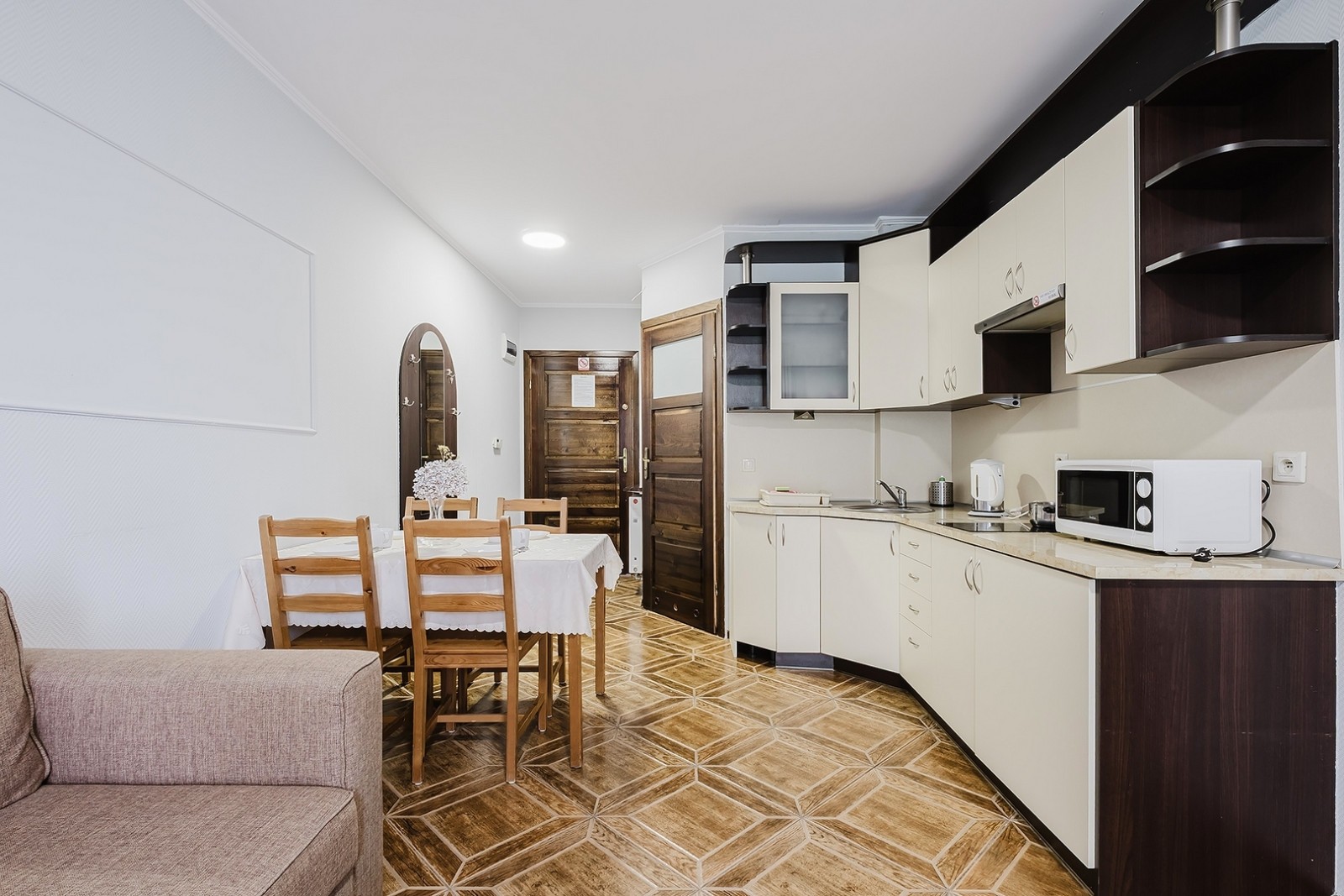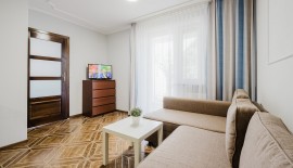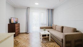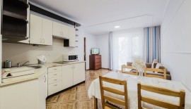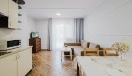 Apartament dwupokojowy Eryk 3 zlokalizowany w obiekcie U na parterze. W skład apartamentu wchodzi łazienka z kabiną prysznicową, dużym aneksem kuchennym wyposażonym w niezbędne naczynia kuchenne, lodówko - zamrażarkę, płytą grzewczą - elektryczną ,mikrofalówka, duży stół oraz kanapo - sofę, mały pokój tapczanik x2, odbiornik TV 32" LED z cyfrową naziemną telewizją, balkon z stoliczkiem i krzesełkami oraz wyjściem na teren zielony. Do apartamentu przydzielone jest 1 bezpłatne miejsce parkingowe. Wi-Fi