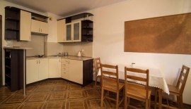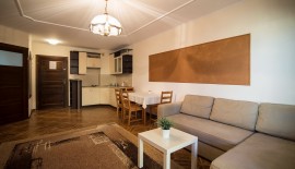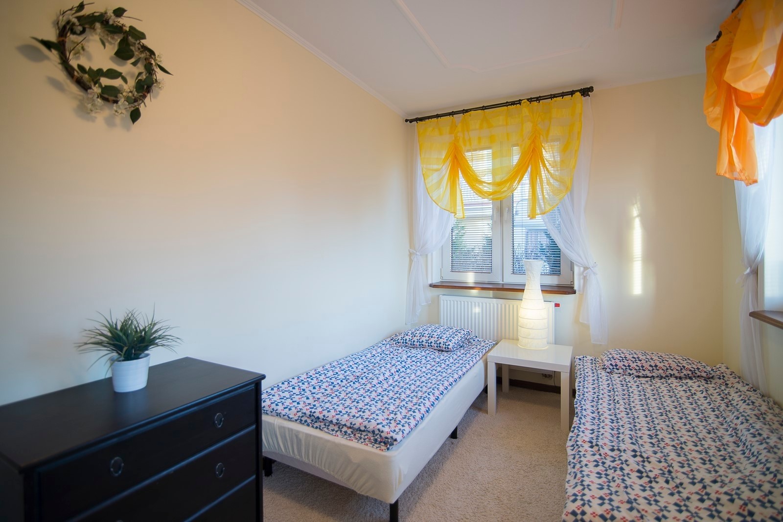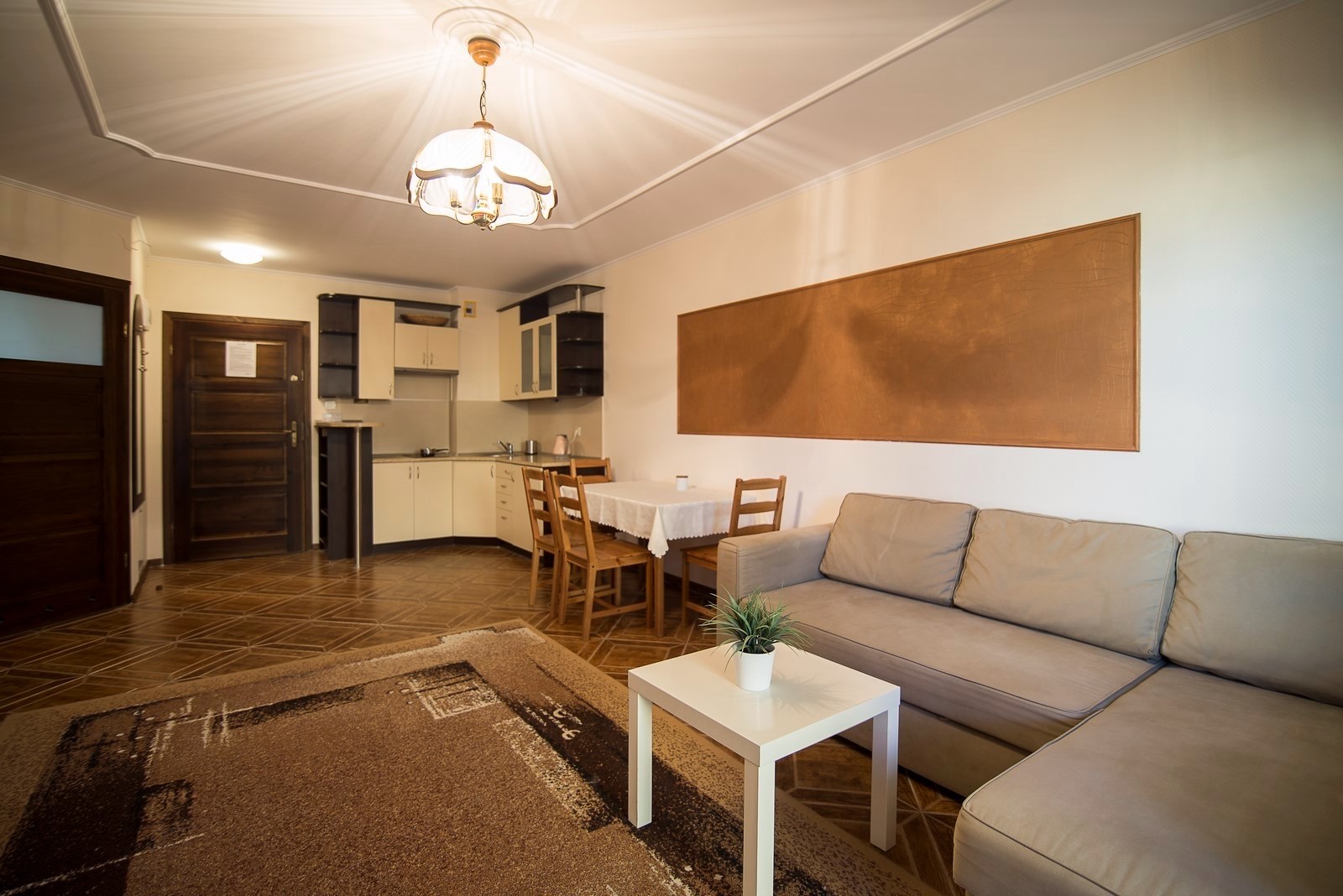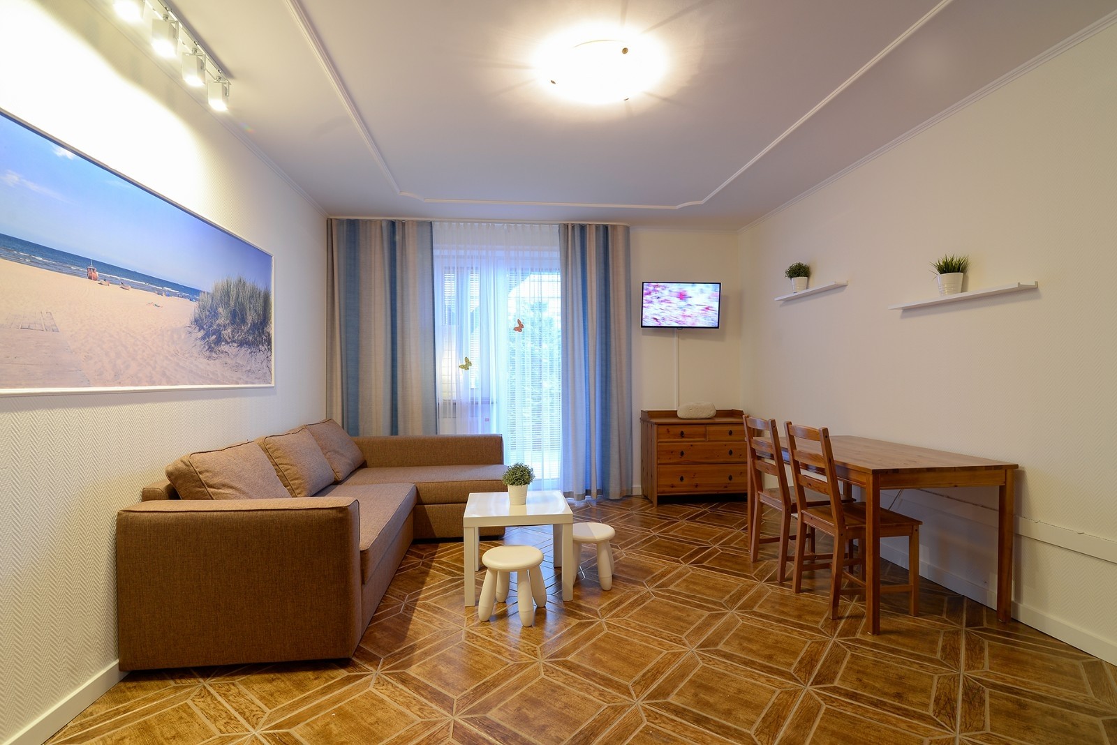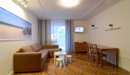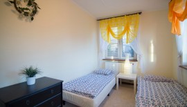 Apartament dwupokojowy Eryk 4 zlokalizowany w obiekcie U na parterze. W skład apartamentu wchodzi widna łazienka z kabiną prysznicową, dużym aneksem kuchennym wyposażonym w niezbędne naczynia kuchenne, lodówko - zamrażarkę, płytą grzewczą - elektryczną , mikrofalówka,  duży stół oraz kanapo - sofę, mały pokój tapczanik x3, odbiornik TV 32" LED z cyfrową naziemną telewizją, balkon z stoliczkiem i krzesełkami oraz wyjściem na teren zielony. Do apartamentu przydzielone jest 1 bezpłatne miejsce parkingowe. Wi-Fi