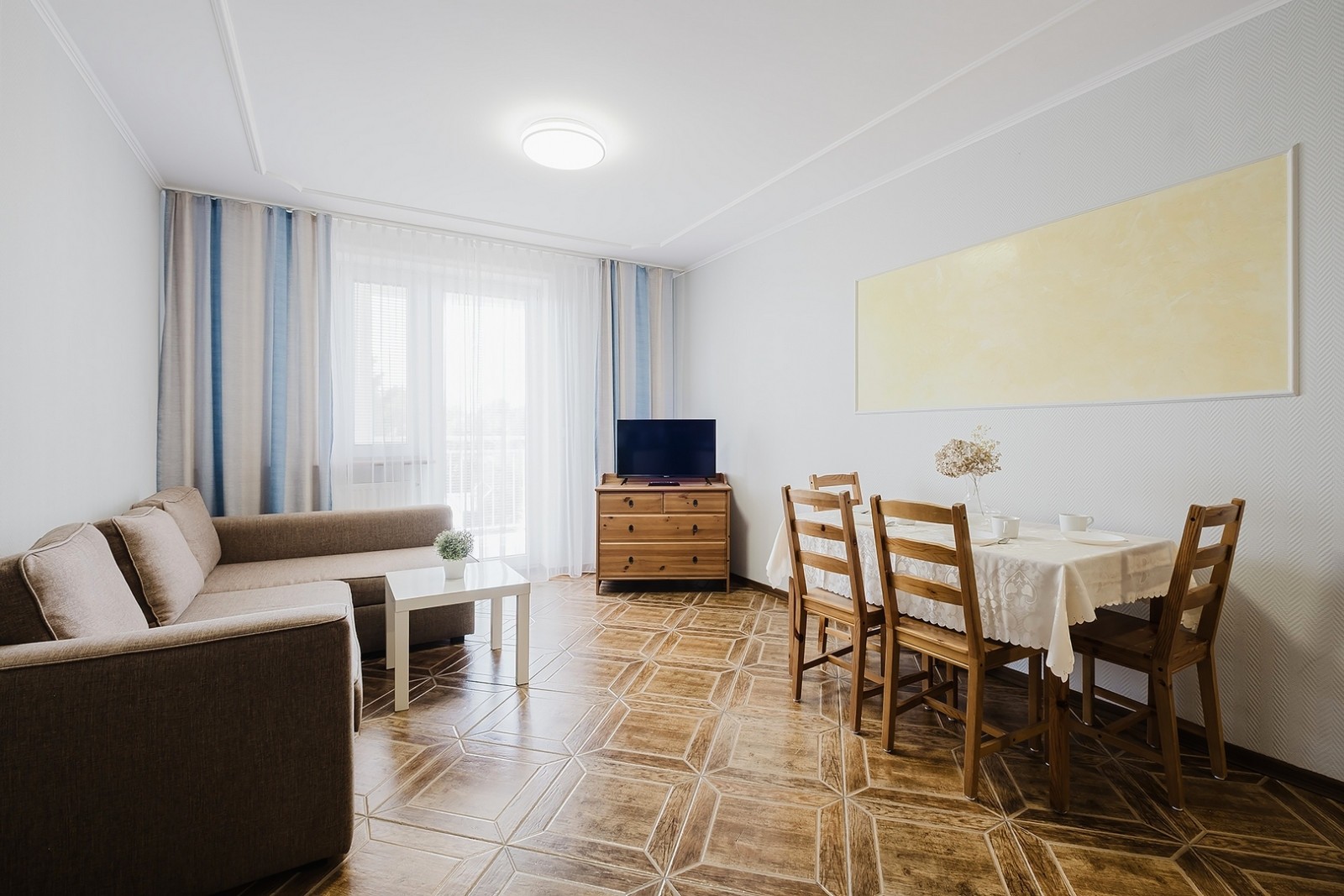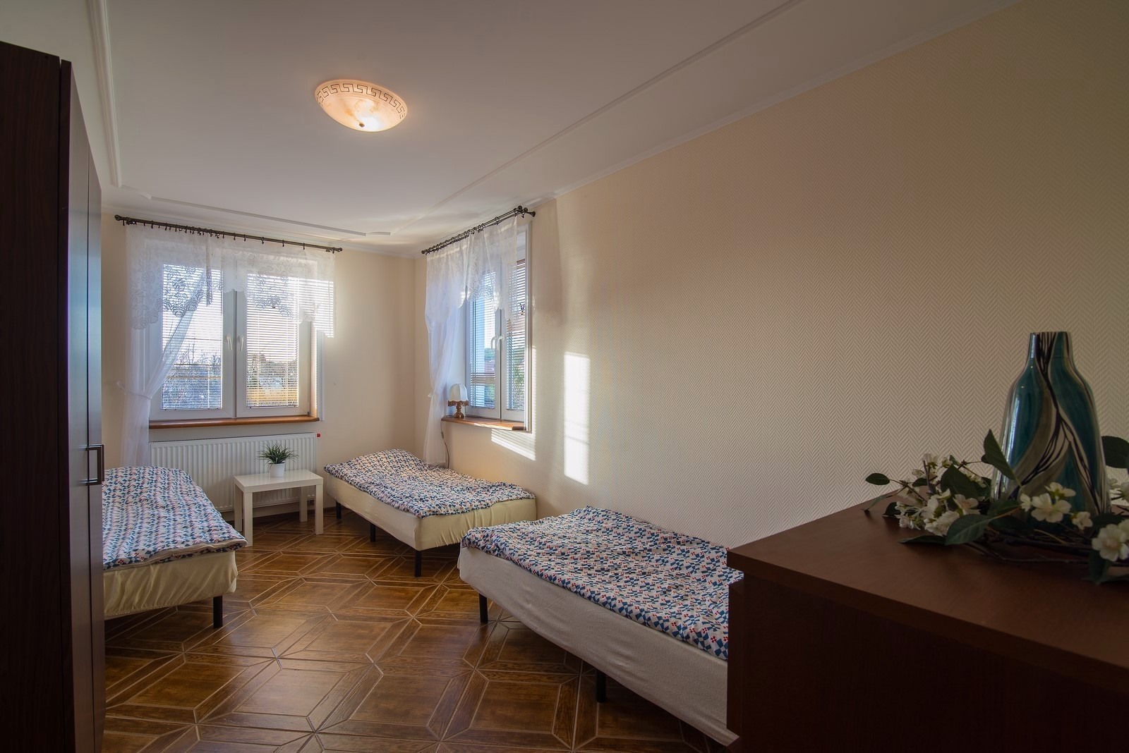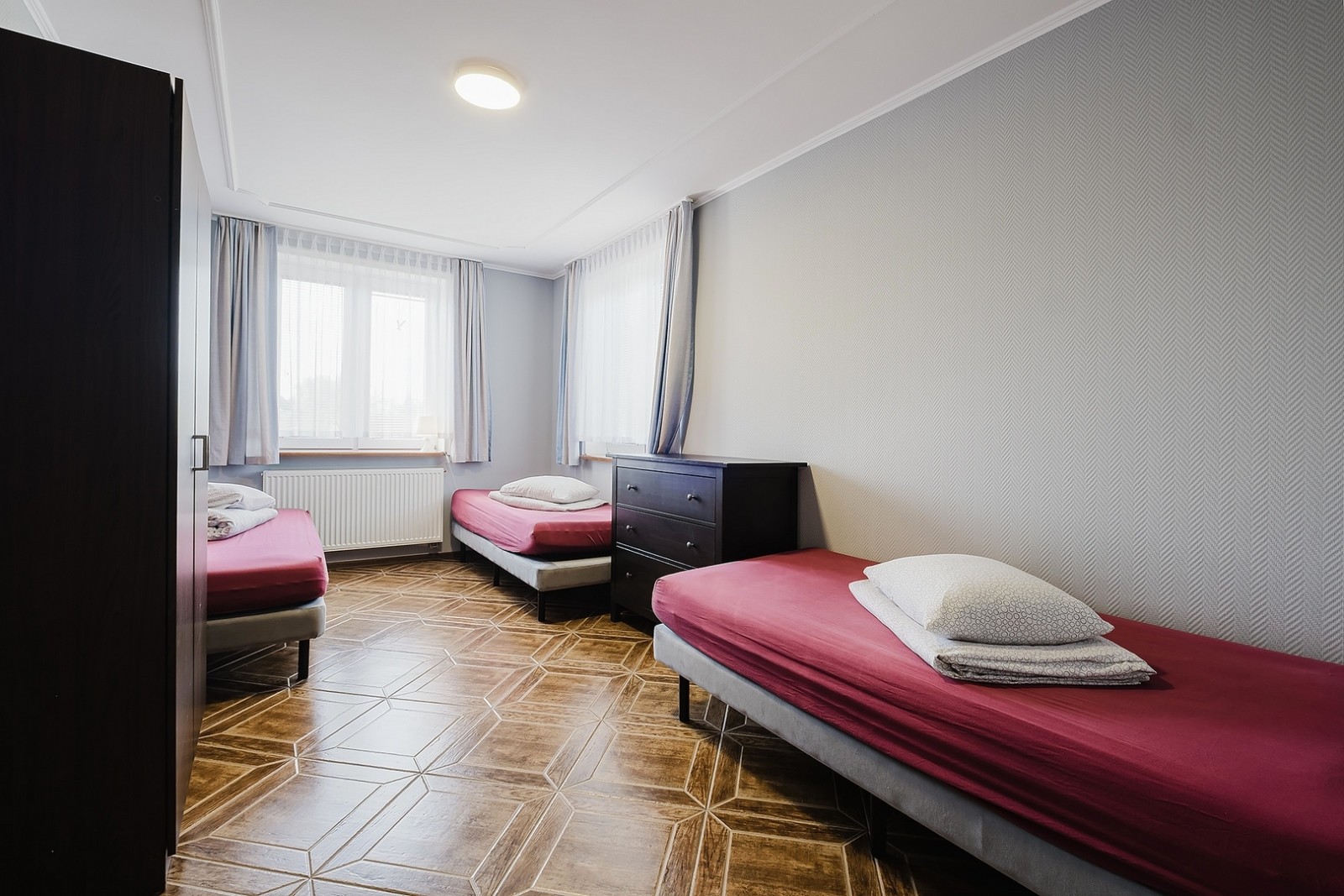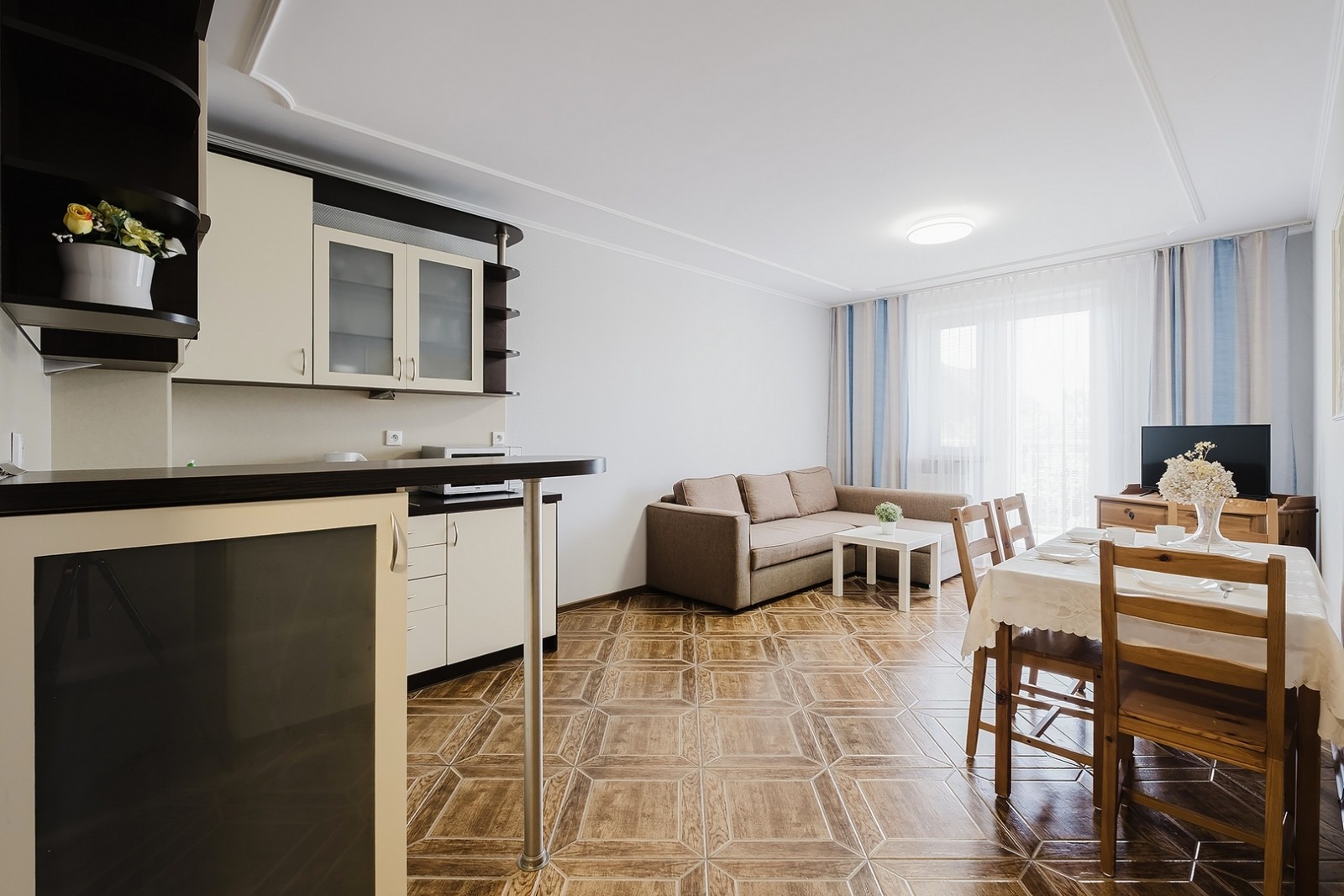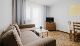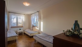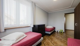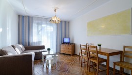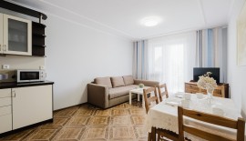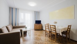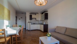 Apartament dwupokojowy Eryk 5 zlokalizowany w obiekcie U na I piętrze. W skład apartamentu wchodzi łazienka z kabiną prysznicową, dużym aneksem kuchennym wyposażonym w niezbędne naczynia kuchenne, lodówko - zamrażarkę, płytą grzewczą - elektryczną , mikrofalówka, duży stół oraz kanapo - sofę,wersalkę młodzieżówkę, mały pokój tapczanik x3, odbiornik TV 32" LED z cyfrową naziemną telewizją, balkon z stoliczkiem i krzesełkami. Do apartamentu przydzielone jest 1 bezpłatne miejsce parkingowe. Wi-Fi