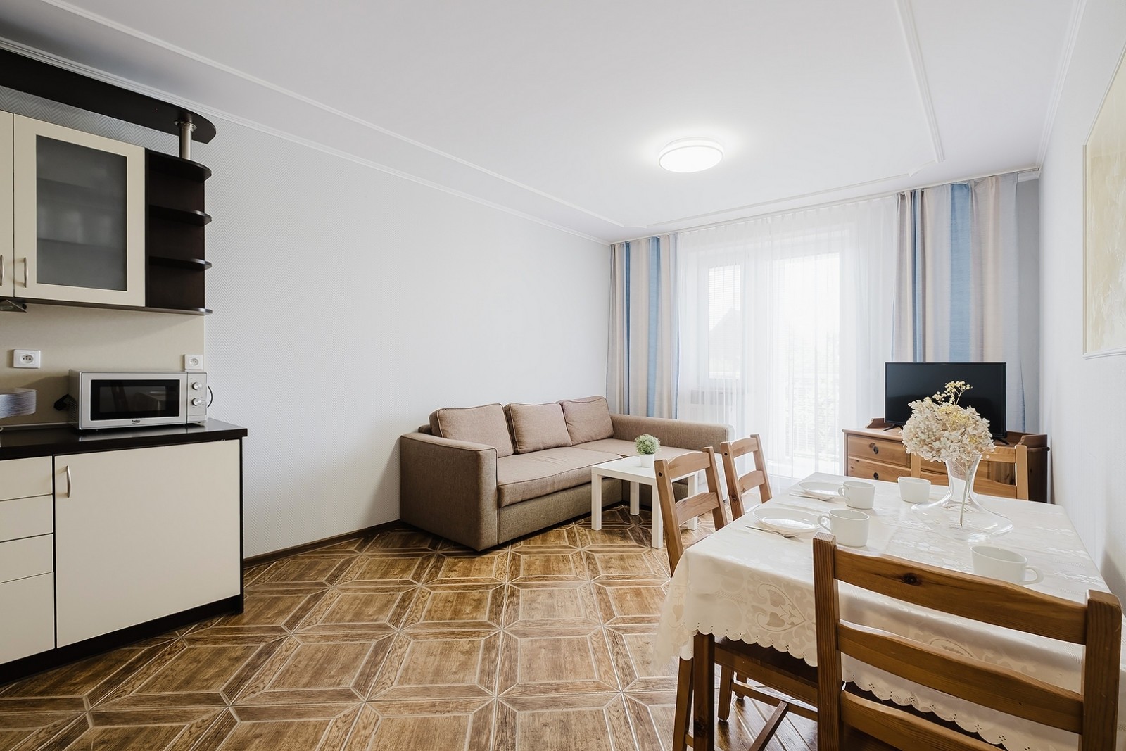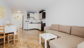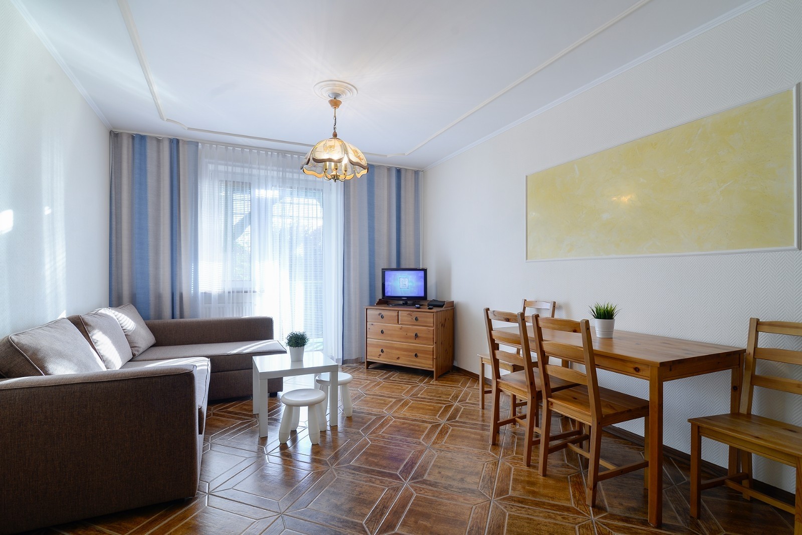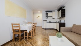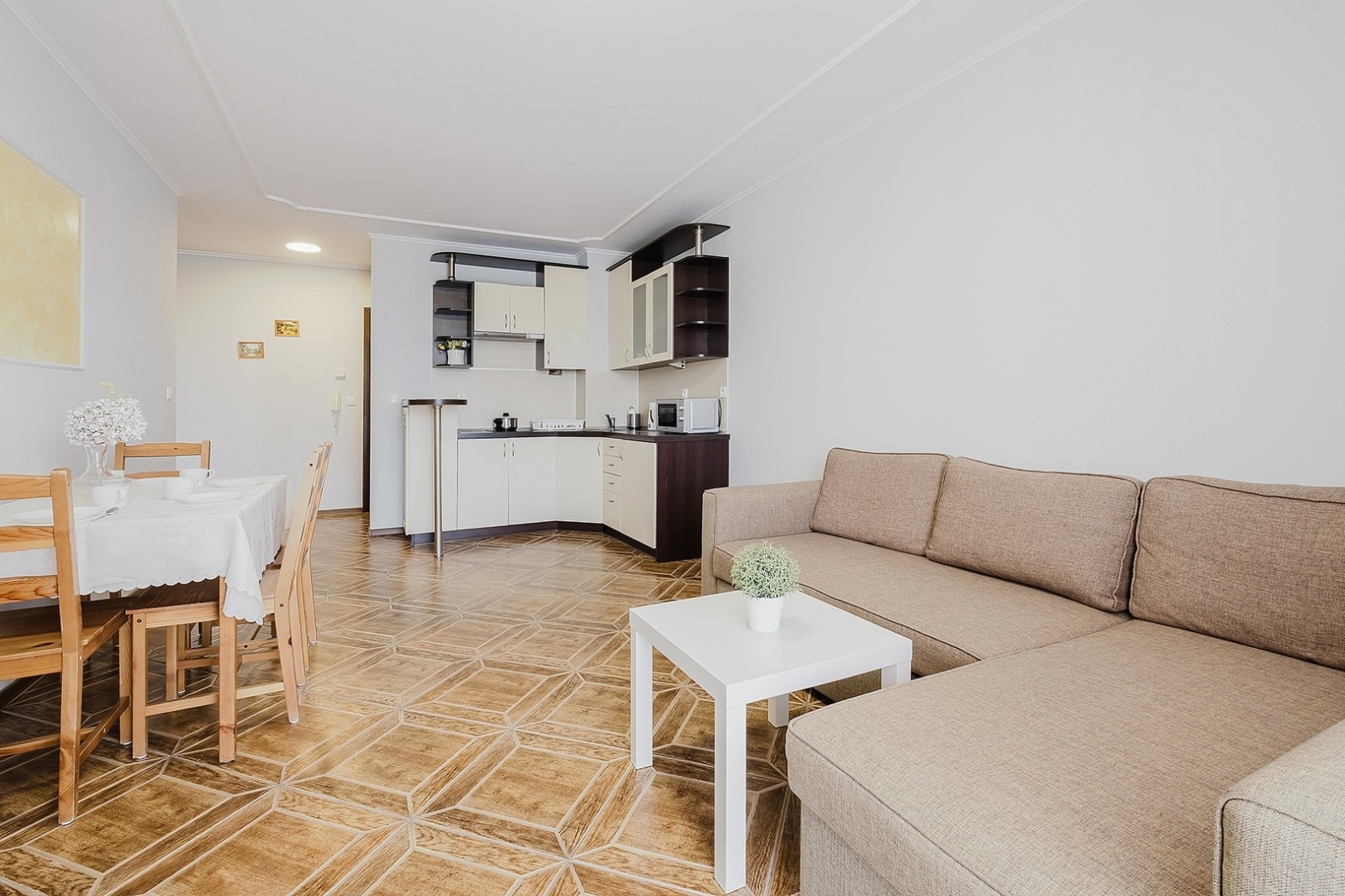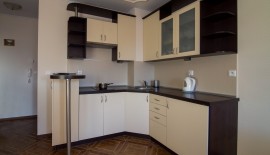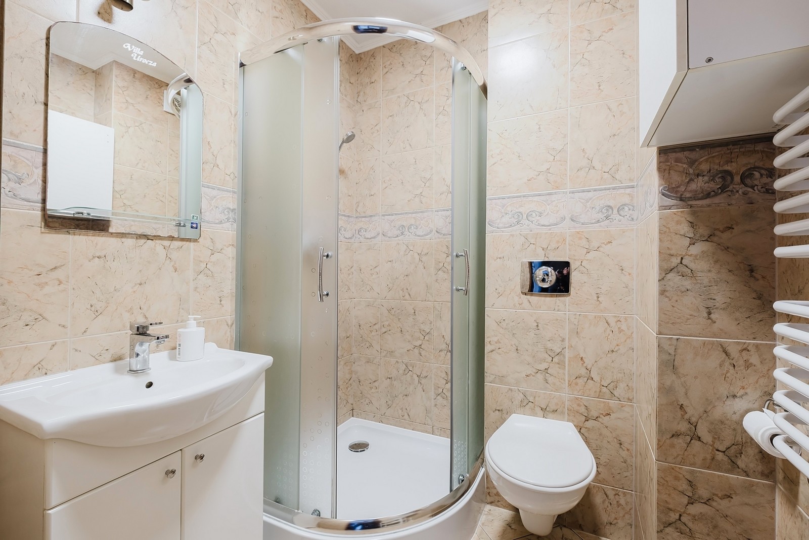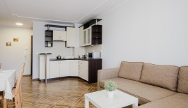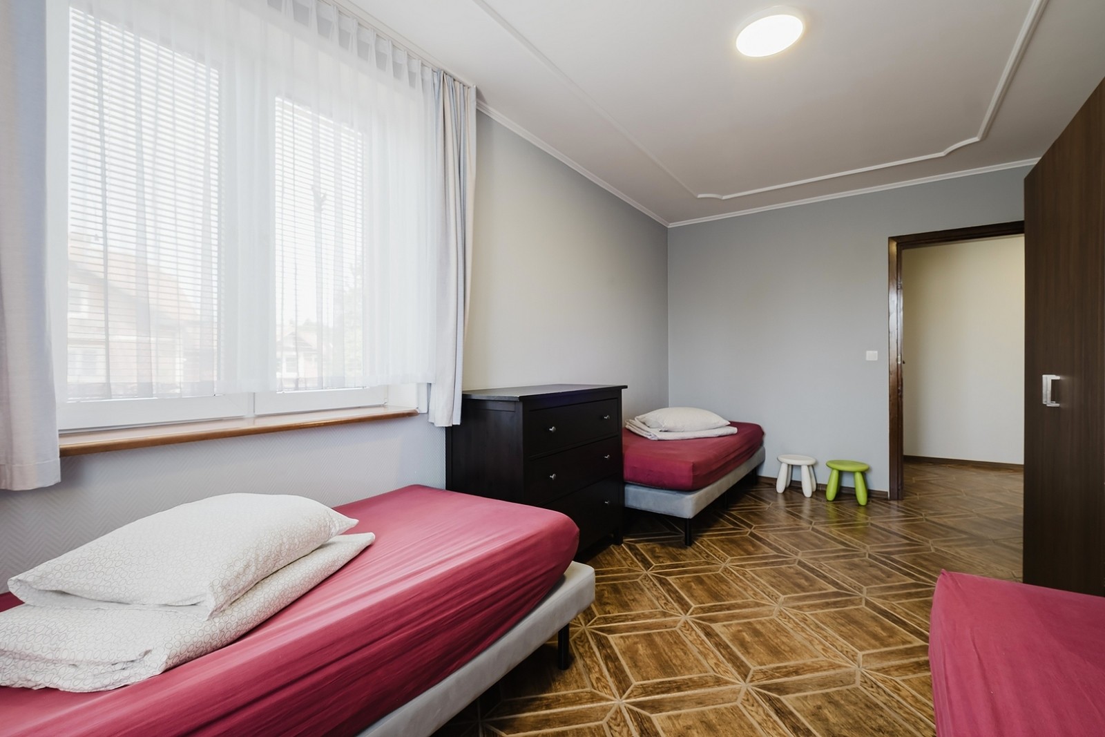Apartament dwupokojowy Eryk 5 zlokalizowany w obiekcie U na I piętrze. W skład apartamentu wchodzi łazienka z kabiną prysznicową, dużym aneksem kuchennym wyposażonym w niezbędne naczynia kuchenne, lodówko - zamrażarkę, płytą grzewczą - elektryczną , mikrofalówka, duży stół oraz kanapo - sofę,wersalkę młodzieżówkę, mały pokój tapczanik x3, odbiornik TV 32" LED z cyfrową naziemną telewizją, balkon z stoliczkiem i krzesełkami. Do apartamentu przydzielone jest 1 bezpłatne miejsce parkingowe. Wi-Fi