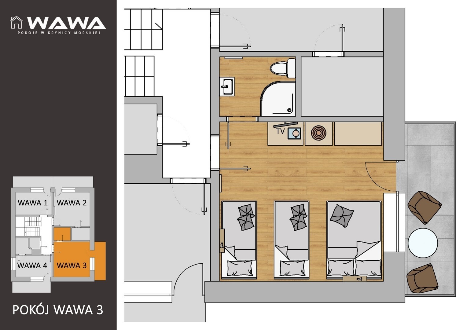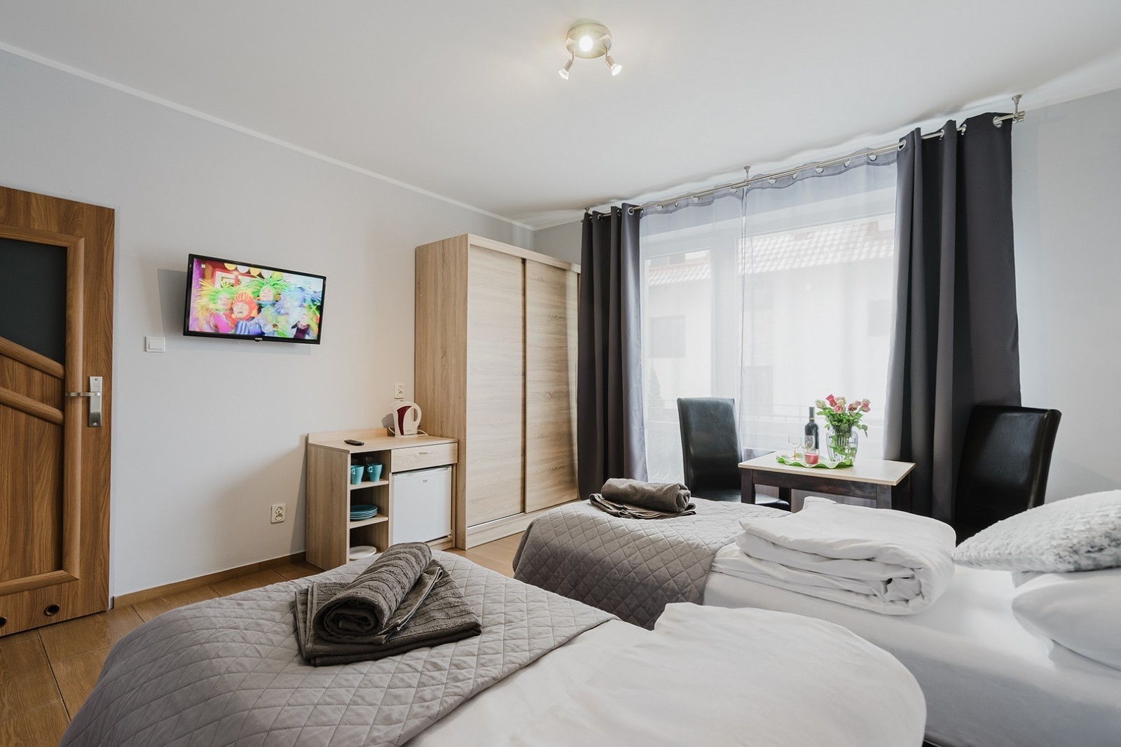 Das Zimmer WaWa 3 befindet sich in der Unterkunft I im I. Stockwerk. Das Zimmer verfügt über: Bad mit Duschkabine, 2x Einzelbett, Schrank, 32-LED-Fernseher mit DVB-T,+ Satellitenanschluss ( NC+, cyfrowy polsat ), Kühlschrank, Wasserkocher, Wlan.Balkon mit kleinem Tisch und Stühlen. Kostenloser Parkplatz.