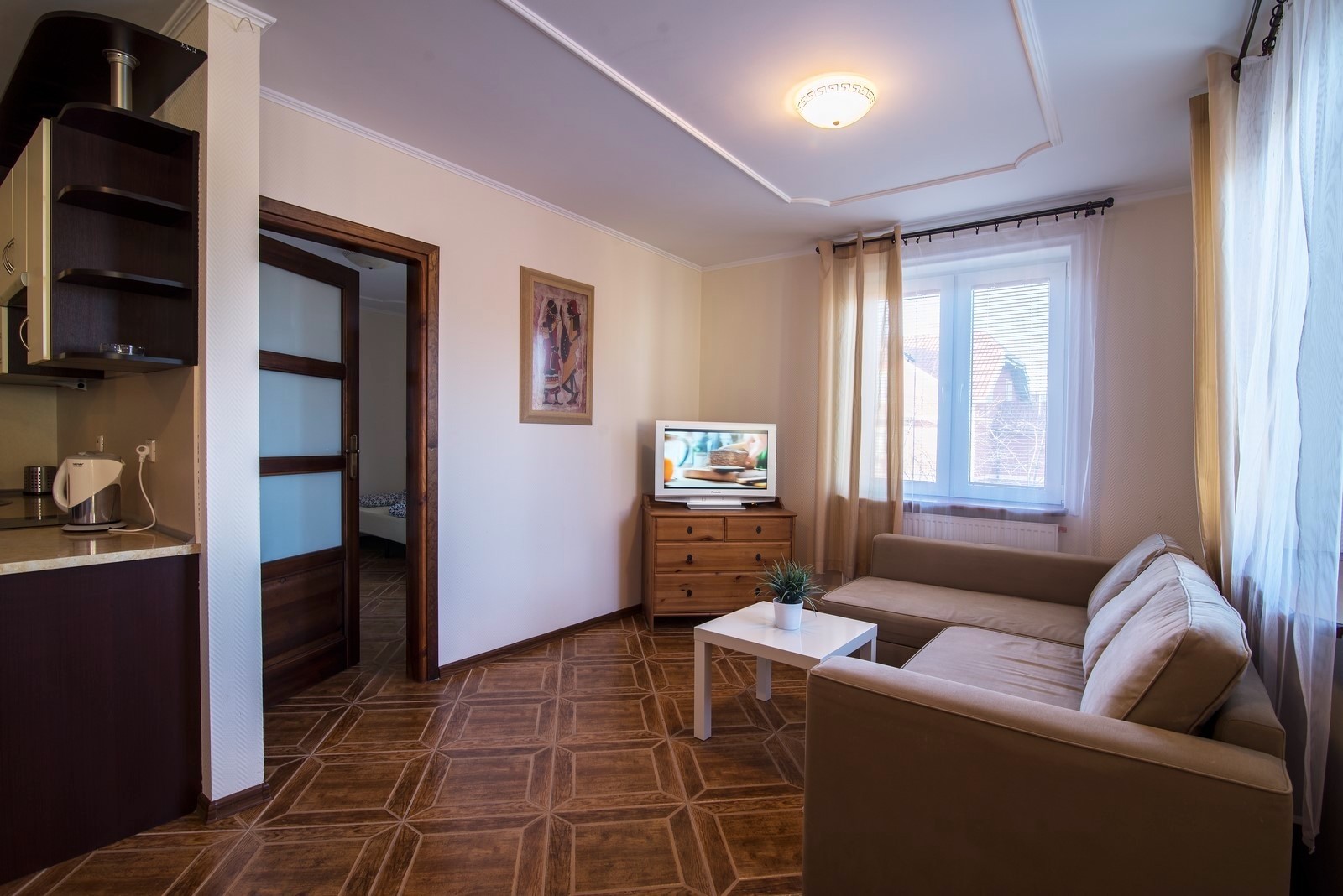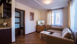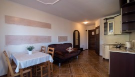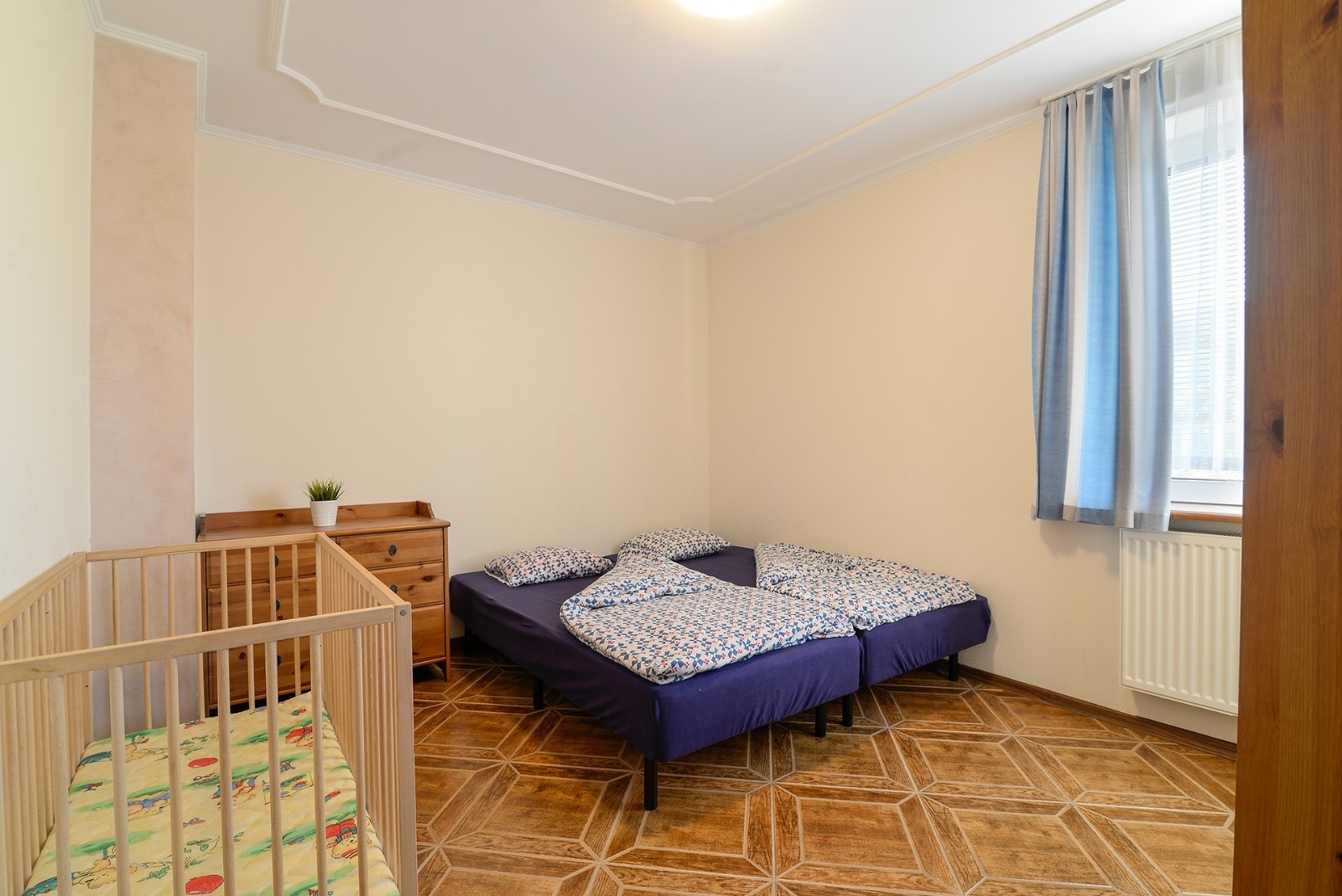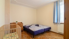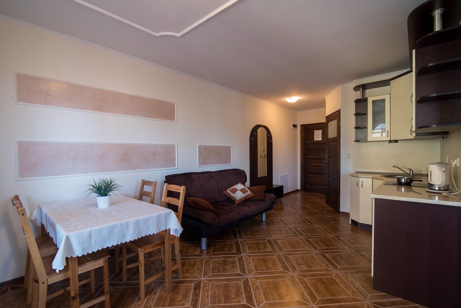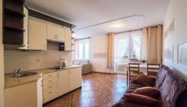 'Eryk 7' is a two-room apartment located in Building U on the 1st floor. The apartment consists of a bathroom with a shower, a living room with a large kitchen area equipped with the necessary dishes and utensils, a fridge, an electric hob, a microwave, a large table and a sofa bed, a small foldable sleeper sofa, a LED TV set with digital terrestrial television, a small bedroom with two single beds, a balcony with a small table and chairs with a view of the Vistula Lagoon, and free Wi-Fi access. The apartment has an allocated parking space.