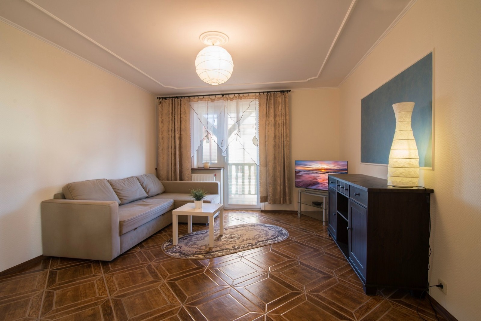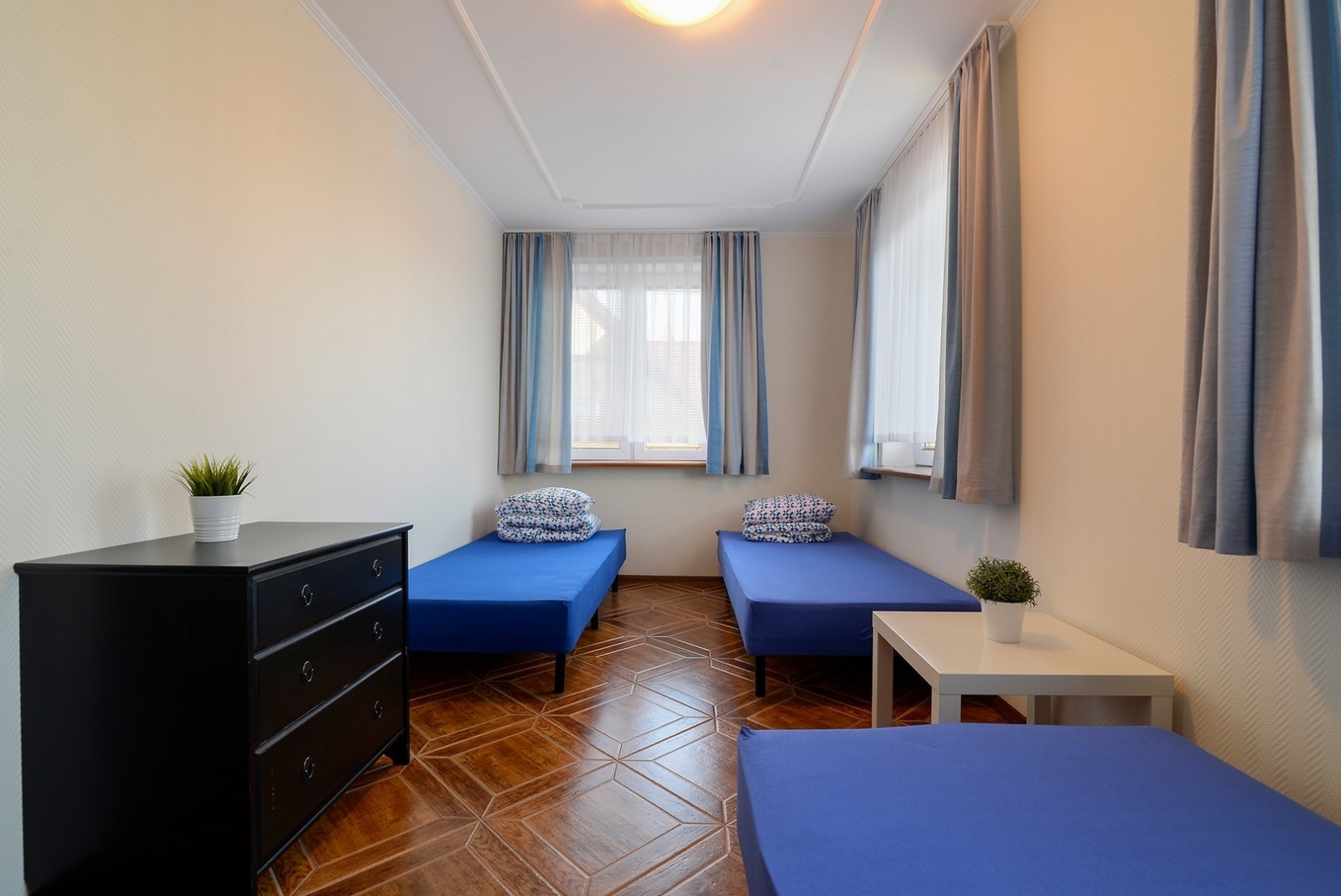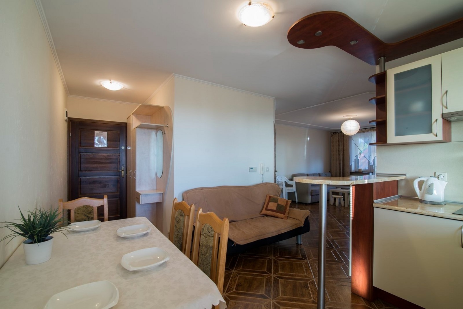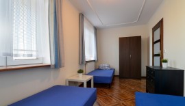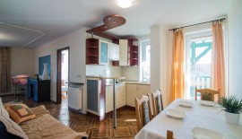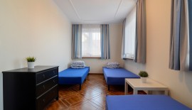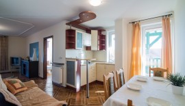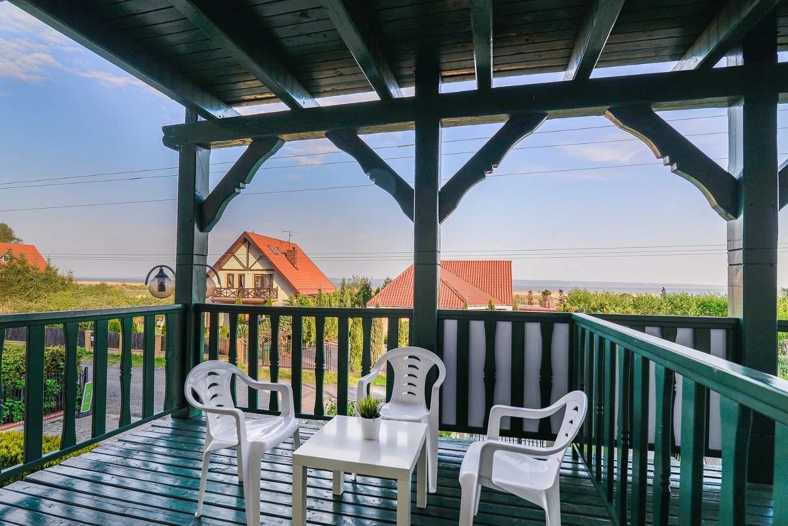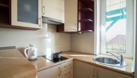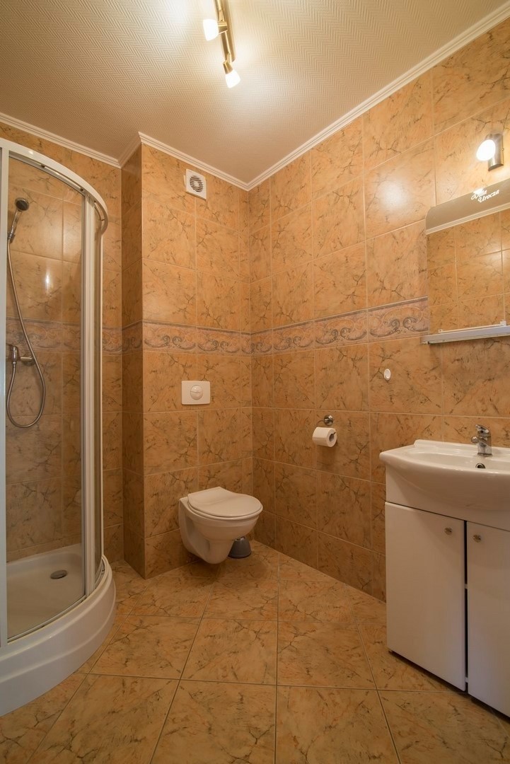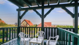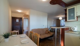 'Eryk 8' is a two-room apartment located in Building U on the 1st floor. The apartment consists of a bathroom with a shower, a living room with a large kitchen area equipped with the necessary dishes and utensils, a fridge, an electric hob, a microwave, a large table and a sofa bed, a small foldable sleeper sofa, a LED TV set with digital terrestrial television, a small bedroom with three single beds, a balcony with a small table and chairs with a view of the Vistula Lagoon, and free Wi-Fi access. The apartment has an allocated parking space