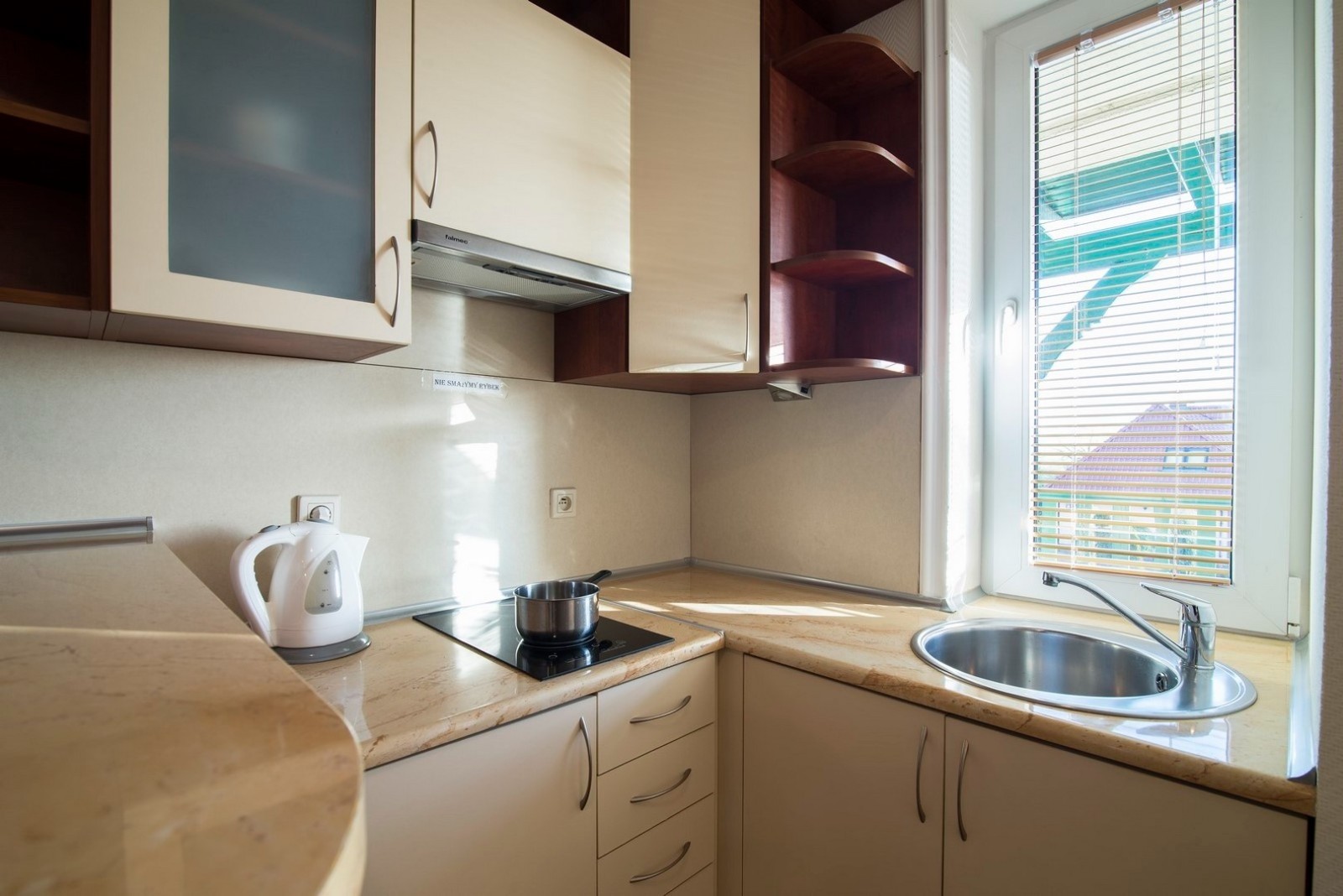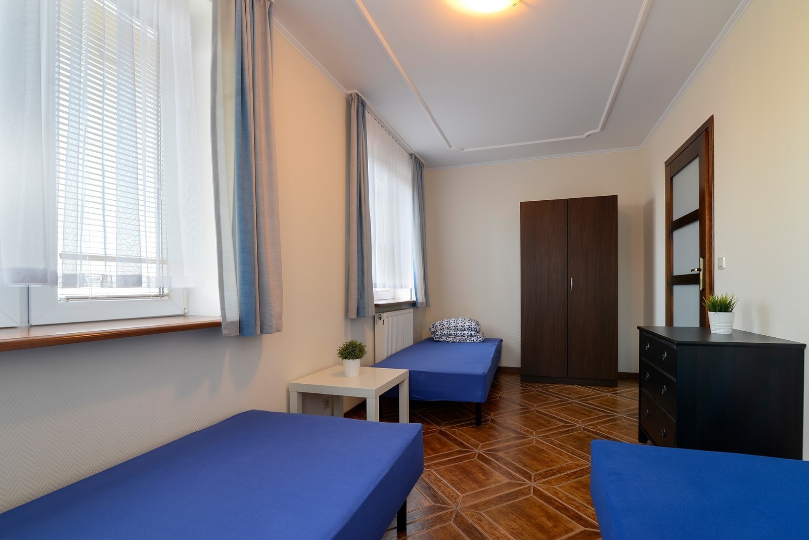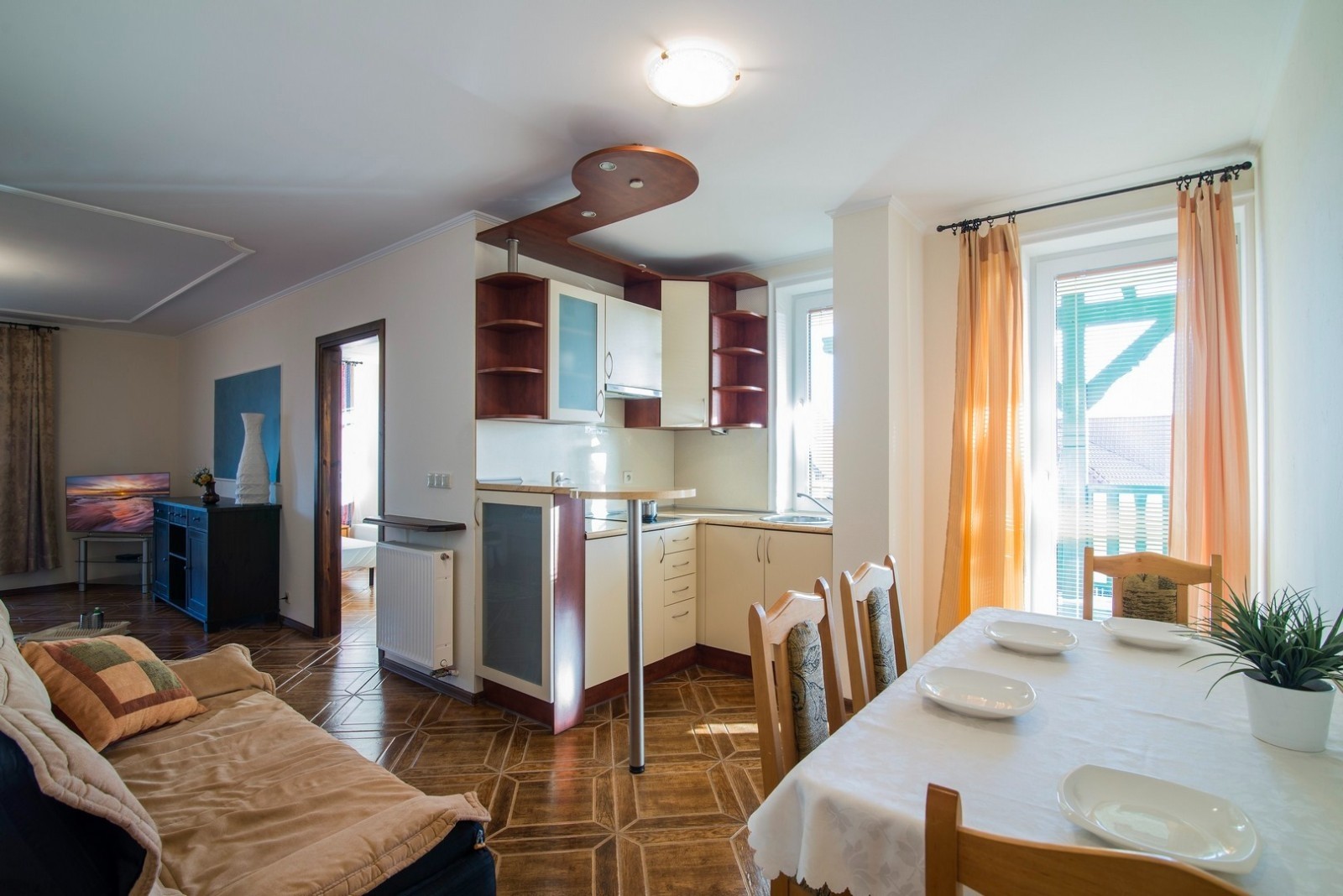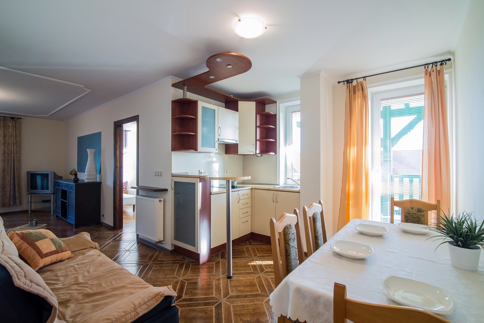 'Eryk 8' is a two-room apartment located in Building U on the 1st floor. The apartment consists of a bathroom with a shower, a living room with a large kitchen area equipped with the necessary dishes and utensils, a fridge, an electric hob, a microwave, a large table and a sofa bed, a small foldable sleeper sofa, a LED TV set with digital terrestrial television, a small bedroom with three single beds, a balcony with a small table and chairs with a view of the Vistula Lagoon, and free Wi-Fi access. The apartment has an allocated parking space