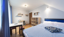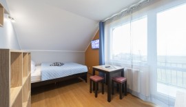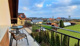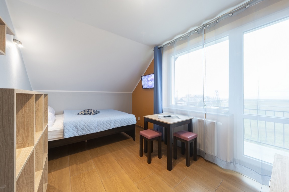 Pokój WaWa 5 zlokalizowany w obiekcie I na II piętrze. W skład pokoju wchodzi własna łazienka z kabiną prysznicową ( wejście z korytarza ), komfortowe łoże małżeńskie, komoda, stolik z dwoma taboretami, TV 32 LED z cyfrową naziemną telewizją + przyłącze do sat ( NC+, cyfrowy polsat ), oraz lodówka, czajnik, szklanki, kieliszki, talerzyki, sztućce. Pokój posiada balkon z krzesełkami i stoliczkiem, widok na wodę, wifi.